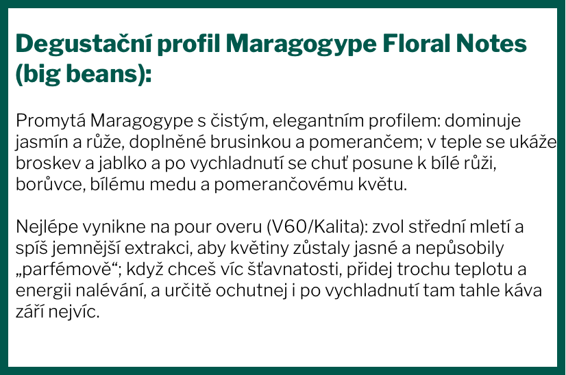 Chuťový profil kávy: Výrazně květinová, čistá a šťavnatá káva s dominantním jasmínem a růží, doplněná brusinkou a pomerančem, v teple s tóny broskve a jablka a po vychladnutí s borůvkou, bílým medem a pomerančovým květem. Více o kávě