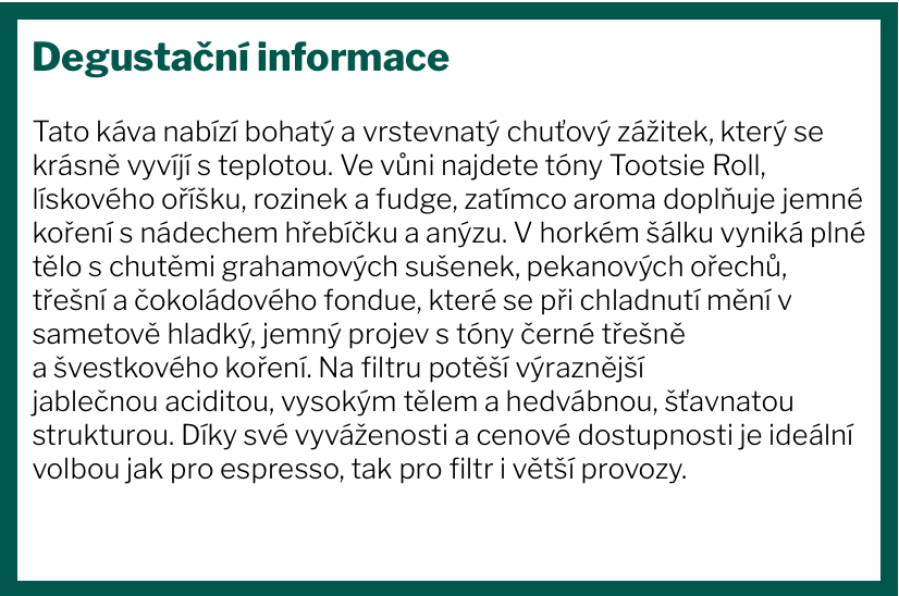 Vyvážená a příjemně sladká káva s tóny jablka, třešně a čokolády, doplněná sametovým tělem a jemnou kořenitostí. Působí harmonicky a plně, s hladkým dozvukem, který funguje skvěle jak na filtr, tak na espresso.