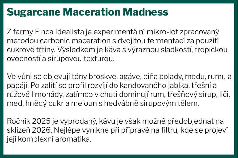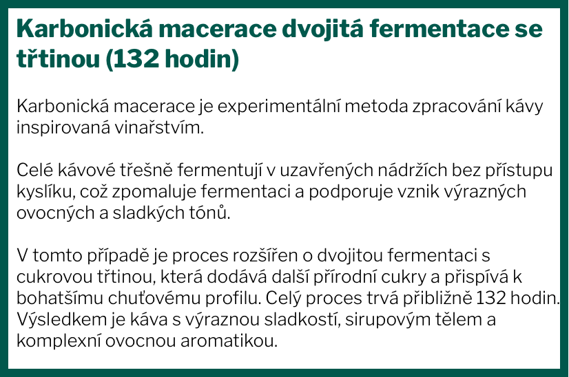 Chuťový profil kávy: Šťavnatá a výrazně ovocná káva s tóny třešňového bonbonu, broskve a kandovaného jablka. Při chladnutí se rozvíjí sladkost agávového sirupu a medu, doplněná o jemné rumové a tropické nuance připomínající papáju a liči. Více o kávě